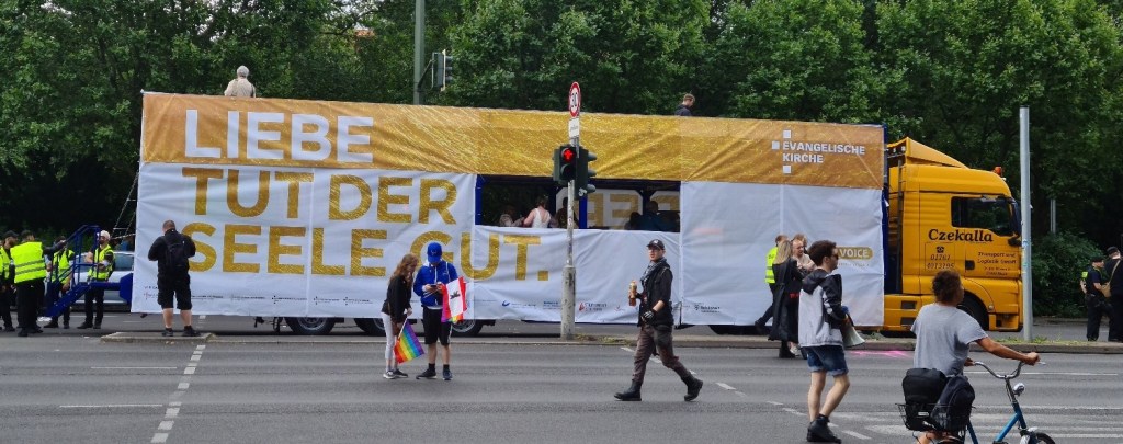 Der Kirchenkreis Berlin-Stadtmitte schickt seit ein paar Jahren einen eigenen Truck samt erstklassigem DJ und der Botschaft „Liebe tut der Seele gut“ ins bunte Getümmel. Ich bin ein großer Fan dieser Aktion und finde, dass die Kirche hier mal am richtigen Ort investiert: Hier ist Kirche tatsächlich mittendrin und wird wahrgenommen. Die meisten Leute, die den Kirchentruck sehen, gucken natürlich so ungläubig, wie sie es tatsächlich auch sind. Dieser Wagen setzt mit seiner Botschaft in goldenen Großbuchstaben ein unerwartetes, starkes Zeichen für kirchliche Zugewandtheit und Nahbarkeit.