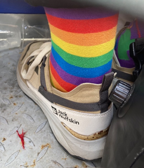 Denn beim CSD geht es ja vor allem ums Zeigen, ums gesehen Werden. Hier zeigen sich Menschen so, wie sie sich sonst nur privat zuhause oder in den Clubs der Stadt zeigen. Zeigen ihren Stolz darauf, so zu sein, wie sie sind: Pride eben. Viel body positivity ist dabei: Es sind gar nicht unbedingt schöne Menschen, die sich hier zeigen. Es sind einfach normale Menschen mit durchschnittlichen Körpern, viele davon werden im Alltag bloß nicht als normal betrachtet. Es sind Männer im Rentenalter dabei, die hier kein Problem haben, ihren Körper so zu zeigen, wie er nun mal ist. Es gibt grellbunte Kostüme, viel Leder, viele Federn, viele Flaggen, und alle haben Spaß. Man will sich einander zeigen, sich aneinander freuen.